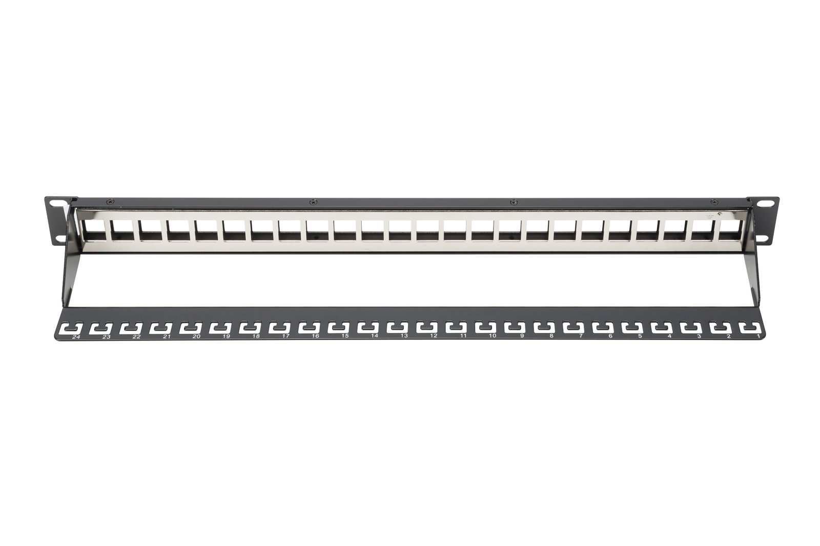 Digitus | Modular Patch Panel | DN-91411 | Black | Layout Keystone Entry: Straight; Area of application: 483 mm (19″) cabinet; Suitable for 483 mm (19″) cabinet mounting; Housing material: 1.5 mm SPCC cold rolled stell sheet, powder-coated; Ports: 24