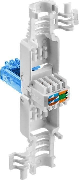 - Kitos savybės: for 3 different cable OD: up to 5.2mm/ 6.4mm/ 7.5mm UTP unshielded with strain relief with cable reducer that can be used for three different cable diameters: up to 5.2 mm/6.4 mm/7.5 mm for stranded and solid inner conductor (AWG 22 to 26) easy and tool-free assembly simply press down on the connector housing supports transmission rates on the order of gigabits cable contacts marked in colour Technical specifications Connections Connection, type RJ45 male (8P8C) Connection 2, type for IDC connectors (toolless) Connection, contact material gold-plated 3µ Cable Specification CAT 6a Shielding class UTP Signal transmission max. bandwidth 500 MHz General Consumption Unit 1 pc. in polybag Length 52 mm Width 15 mm Height 15 mm